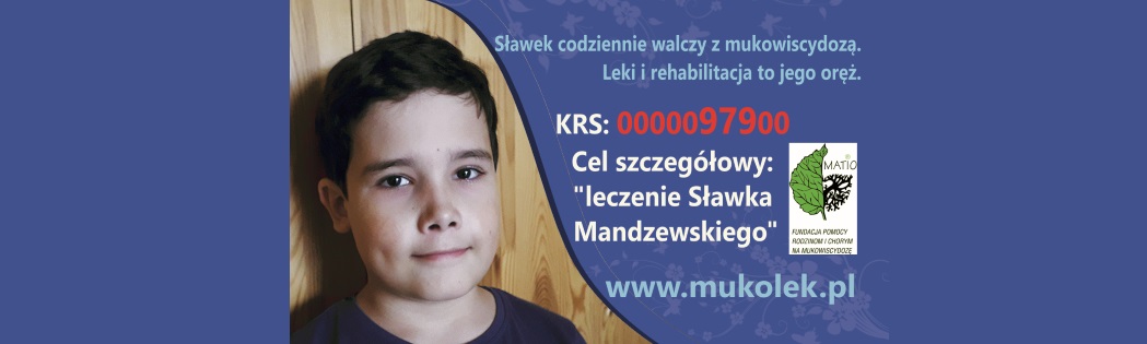 Sławek urodził się w 2011 roku. Diagnoza o mukowiscydozie przyszła szybko, bo Sławka objęły badania przesiewowe. Od tamtej pory sporą część naszego życia stanowiły najpierw – badania i poszukiwania lekarzy, a potem – ścisły plan dnia obejmujący inhalacje, rehabilitacje i leki. Mamy szczęście, że znaleźliśmy świetnych lekarzy (choć do poradni muko dojeżdżamy 150 km). Mamy szczęście, a może to częściowo efekt naszych starań, że Sławek nie wymaga częstych hospitalizacji, bo z bieżącymi infekcjami radzimy sobie w domu. Mamy szczęście, że starszy brat jest zdrowy. Mamy szczęście, że od początku mieliśmy i nadal mamy wsparcie w rodzinie i wśród znajomych, za co serdecznie i nieustająco dziękujemy. Mamy też wsparcie fundacji, które zajmują się chorymi na muko więc znają i rozumieją nasze problemy. Tylko dzięki nim te aspekty, które są mniej szczęśliwe, są trochę łatwiejsze do ogarnięcia. Mamy szczęście, że właśnie teraz pojawiły się leki przyczynowe, a Sławek doczekał ich w dobrym stanie zdrowia. A nie wszystko jest różowo – Sławek sporo choruje od jesieni do wiosny, co przekłada się na spory stres związany ze szkolnymi zaległościami i przerywanymi kontaktami z kolegami. A czasami przejściem na nauczanie indywidualne, zdalne. Ma problemy z wątrobą i niewydolną trzustkę. Wymaga kontroli diety i podawania leków do każdego posiłku. Każdego dnia ma inhalacje, które zabierają sporo czasu, a w przypadku wyjazdów – wymagają zabierania ze sobą olbrzymiej torby ze sprzętem do inhalacji, sterylizacji i leków w niskiej temperaturze. Jest w tym jeszcze na koniec okruch szczęścia: czy to w efekcie naszej walki i starań, czy to taka uroda Sławkowej choroby, ale póki co muko nie zaatakowała z całą mocą płuc Sławka. To co się złego dzieje – potrafimy utrzymać w szachu.